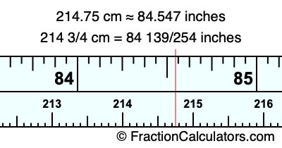 One centimeter is equal to 50/127 inches, and 214.75 as a fraction is 214 3/4. Therefore, to get the fractional answer to 214.75 cm in inches, we multiply 214 3/4 by 50/127 and simplify if necessary.