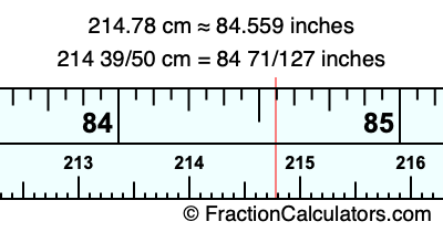 One centimeter is equal to 50/127 inches, and 214.78 as a fraction is 214 39/50. Therefore, to get the fractional answer to 214.78 cm in inches, we multiply 214 39/50 by 50/127 and simplify if necessary.
