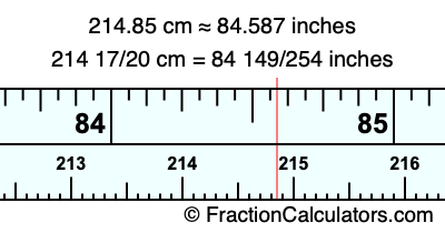 One centimeter is equal to 50/127 inches, and 214.85 as a fraction is 214 17/20. Therefore, to get the fractional answer to 214.85 cm in inches, we multiply 214 17/20 by 50/127 and simplify if necessary.