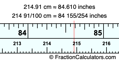 One centimeter is equal to 50/127 inches, and 214.91 as a fraction is 214 91/100. Therefore, to get the fractional answer to 214.91 cm in inches, we multiply 214 91/100 by 50/127 and simplify if necessary.