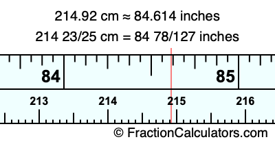 One centimeter is equal to 50/127 inches, and 214.92 as a fraction is 214 23/25. Therefore, to get the fractional answer to 214.92 cm in inches, we multiply 214 23/25 by 50/127 and simplify if necessary.