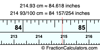 One centimeter is equal to 50/127 inches, and 214.93 as a fraction is 214 93/100. Therefore, to get the fractional answer to 214.93 cm in inches, we multiply 214 93/100 by 50/127 and simplify if necessary.