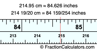 One centimeter is equal to 50/127 inches, and 214.95 as a fraction is 214 19/20. Therefore, to get the fractional answer to 214.95 cm in inches, we multiply 214 19/20 by 50/127 and simplify if necessary.