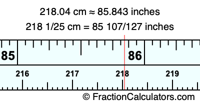 One centimeter is equal to 50/127 inches, and 218.04 as a fraction is 218 1/25. Therefore, to get the fractional answer to 218.04 cm in inches, we multiply 218 1/25 by 50/127 and simplify if necessary.