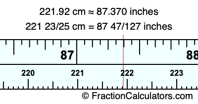 One centimeter is equal to 50/127 inches, and 221.92 as a fraction is 221 23/25. Therefore, to get the fractional answer to 221.92 cm in inches, we multiply 221 23/25 by 50/127 and simplify if necessary.
