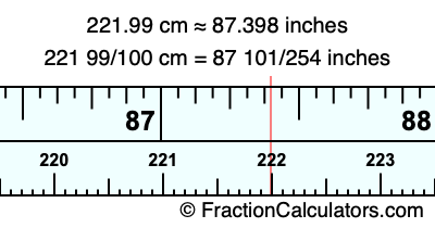 One centimeter is equal to 50/127 inches, and 221.99 as a fraction is 221 99/100. Therefore, to get the fractional answer to 221.99 cm in inches, we multiply 221 99/100 by 50/127 and simplify if necessary.