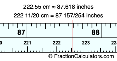 One centimeter is equal to 50/127 inches, and 222.55 as a fraction is 222 11/20. Therefore, to get the fractional answer to 222.55 cm in inches, we multiply 222 11/20 by 50/127 and simplify if necessary.