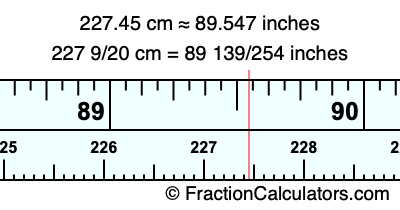One centimeter is equal to 50/127 inches, and 227.45 as a fraction is 227 9/20. Therefore, to get the fractional answer to 227.45 cm in inches, we multiply 227 9/20 by 50/127 and simplify if necessary.