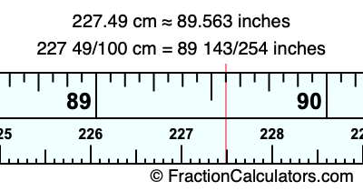 One centimeter is equal to 50/127 inches, and 227.49 as a fraction is 227 49/100. Therefore, to get the fractional answer to 227.49 cm in inches, we multiply 227 49/100 by 50/127 and simplify if necessary.