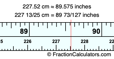 One centimeter is equal to 50/127 inches, and 227.52 as a fraction is 227 13/25. Therefore, to get the fractional answer to 227.52 cm in inches, we multiply 227 13/25 by 50/127 and simplify if necessary.