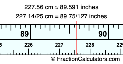 One centimeter is equal to 50/127 inches, and 227.56 as a fraction is 227 14/25. Therefore, to get the fractional answer to 227.56 cm in inches, we multiply 227 14/25 by 50/127 and simplify if necessary.