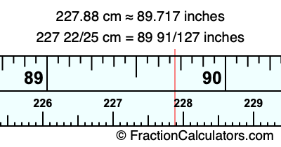 One centimeter is equal to 50/127 inches, and 227.88 as a fraction is 227 22/25. Therefore, to get the fractional answer to 227.88 cm in inches, we multiply 227 22/25 by 50/127 and simplify if necessary.