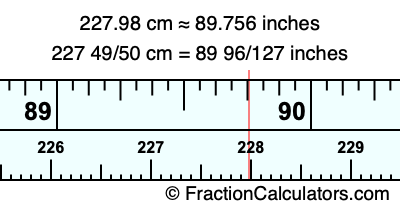 One centimeter is equal to 50/127 inches, and 227.98 as a fraction is 227 49/50. Therefore, to get the fractional answer to 227.98 cm in inches, we multiply 227 49/50 by 50/127 and simplify if necessary.