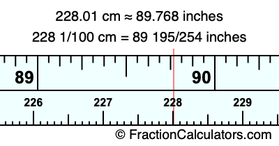 One centimeter is equal to 50/127 inches, and 228.01 as a fraction is 228 1/100. Therefore, to get the fractional answer to 228.01 cm in inches, we multiply 228 1/100 by 50/127 and simplify if necessary.
