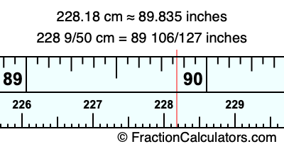 One centimeter is equal to 50/127 inches, and 228.18 as a fraction is 228 9/50. Therefore, to get the fractional answer to 228.18 cm in inches, we multiply 228 9/50 by 50/127 and simplify if necessary.