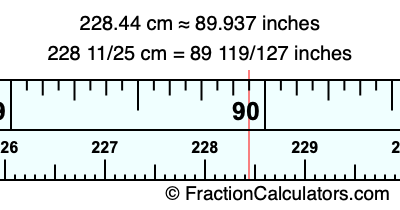 One centimeter is equal to 50/127 inches, and 228.44 as a fraction is 228 11/25. Therefore, to get the fractional answer to 228.44 cm in inches, we multiply 228 11/25 by 50/127 and simplify if necessary.