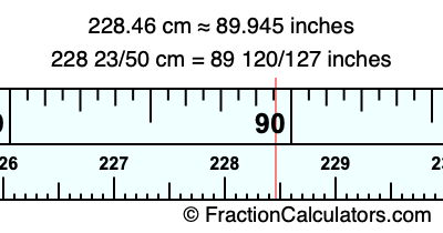 One centimeter is equal to 50/127 inches, and 228.46 as a fraction is 228 23/50. Therefore, to get the fractional answer to 228.46 cm in inches, we multiply 228 23/50 by 50/127 and simplify if necessary.