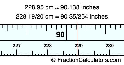 One centimeter is equal to 50/127 inches, and 228.95 as a fraction is 228 19/20. Therefore, to get the fractional answer to 228.95 cm in inches, we multiply 228 19/20 by 50/127 and simplify if necessary.