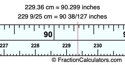 One centimeter is equal to 50/127 inches, and 229.36 as a fraction is 229 9/25. Therefore, to get the fractional answer to 229.36 cm in inches, we multiply 229 9/25 by 50/127 and simplify if necessary.