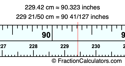 One centimeter is equal to 50/127 inches, and 229.42 as a fraction is 229 21/50. Therefore, to get the fractional answer to 229.42 cm in inches, we multiply 229 21/50 by 50/127 and simplify if necessary.