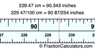 One centimeter is equal to 50/127 inches, and 229.47 as a fraction is 229 47/100. Therefore, to get the fractional answer to 229.47 cm in inches, we multiply 229 47/100 by 50/127 and simplify if necessary.