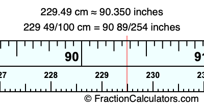 One centimeter is equal to 50/127 inches, and 229.49 as a fraction is 229 49/100. Therefore, to get the fractional answer to 229.49 cm in inches, we multiply 229 49/100 by 50/127 and simplify if necessary.