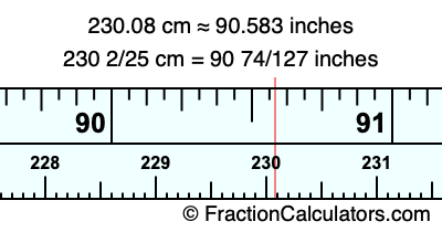 One centimeter is equal to 50/127 inches, and 230.08 as a fraction is 230 2/25. Therefore, to get the fractional answer to 230.08 cm in inches, we multiply 230 2/25 by 50/127 and simplify if necessary.