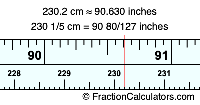 One centimeter is equal to 50/127 inches, and 230.2 as a fraction is 230 1/5. Therefore, to get the fractional answer to 230.2 cm in inches, we multiply 230 1/5 by 50/127 and simplify if necessary.
