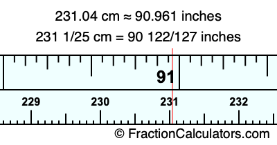 One centimeter is equal to 50/127 inches, and 231.04 as a fraction is 231 1/25. Therefore, to get the fractional answer to 231.04 cm in inches, we multiply 231 1/25 by 50/127 and simplify if necessary.