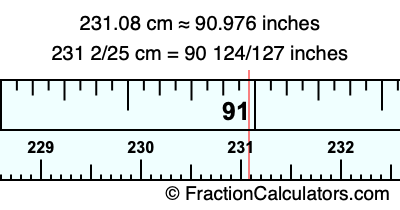 One centimeter is equal to 50/127 inches, and 231.08 as a fraction is 231 2/25. Therefore, to get the fractional answer to 231.08 cm in inches, we multiply 231 2/25 by 50/127 and simplify if necessary.