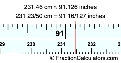 One centimeter is equal to 50/127 inches, and 231.46 as a fraction is 231 23/50. Therefore, to get the fractional answer to 231.46 cm in inches, we multiply 231 23/50 by 50/127 and simplify if necessary.