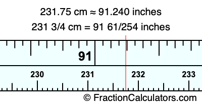 Here is how to convert 231.75 cm to inches. We will give you the fractional answer, the decimal answer, and illustrate the answer on our tape measure.