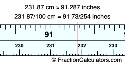 One centimeter is equal to 50/127 inches, and 231.87 as a fraction is 231 87/100. Therefore, to get the fractional answer to 231.87 cm in inches, we multiply 231 87/100 by 50/127 and simplify if necessary.