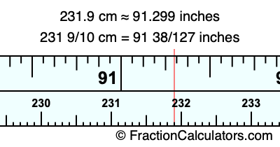 One centimeter is equal to 50/127 inches, and 231.9 as a fraction is 231 9/10. Therefore, to get the fractional answer to 231.9 cm in inches, we multiply 231 9/10 by 50/127 and simplify if necessary.