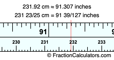 One centimeter is equal to 50/127 inches, and 231.92 as a fraction is 231 23/25. Therefore, to get the fractional answer to 231.92 cm in inches, we multiply 231 23/25 by 50/127 and simplify if necessary.