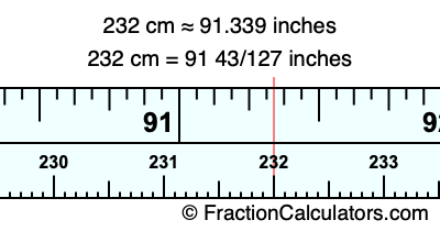 One centimeter is equal to 50/127 inches, and 232 as a fraction is 232. Therefore, to get the fractional answer to 232 cm in inches, we multiply 232 by 50/127 and simplify if necessary.