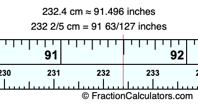 One centimeter is equal to 50/127 inches, and 232.4 as a fraction is 232 2/5. Therefore, to get the fractional answer to 232.4 cm in inches, we multiply 232 2/5 by 50/127 and simplify if necessary.