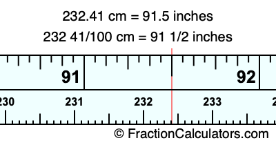 One centimeter is equal to 50/127 inches, and 232.41 as a fraction is 232 41/100. Therefore, to get the fractional answer to 232.41 cm in inches, we multiply 232 41/100 by 50/127 and simplify if necessary.