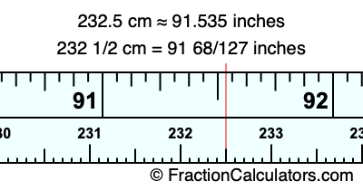 One centimeter is equal to 50/127 inches, and 232.5 as a fraction is 232 1/2. Therefore, to get the fractional answer to 232.5 cm in inches, we multiply 232 1/2 by 50/127 and simplify if necessary.
