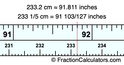 One centimeter is equal to 50/127 inches, and 233.2 as a fraction is 233 1/5. Therefore, to get the fractional answer to 233.2 cm in inches, we multiply 233 1/5 by 50/127 and simplify if necessary.