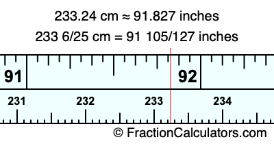 One centimeter is equal to 50/127 inches, and 233.24 as a fraction is 233 6/25. Therefore, to get the fractional answer to 233.24 cm in inches, we multiply 233 6/25 by 50/127 and simplify if necessary.