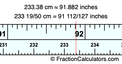 Here is how to convert 233.38 cm to inches. We will give you the fractional answer, the decimal answer, and illustrate the answer on our tape measure.