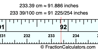 One centimeter is equal to 50/127 inches, and 233.39 as a fraction is 233 39/100. Therefore, to get the fractional answer to 233.39 cm in inches, we multiply 233 39/100 by 50/127 and simplify if necessary.
