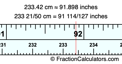 One centimeter is equal to 50/127 inches, and 233.42 as a fraction is 233 21/50. Therefore, to get the fractional answer to 233.42 cm in inches, we multiply 233 21/50 by 50/127 and simplify if necessary.