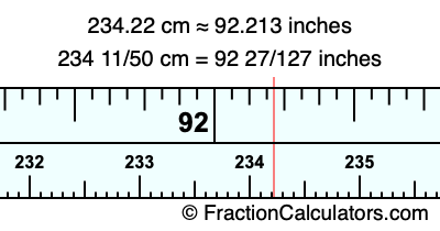 One centimeter is equal to 50/127 inches, and 234.22 as a fraction is 234 11/50. Therefore, to get the fractional answer to 234.22 cm in inches, we multiply 234 11/50 by 50/127 and simplify if necessary.
