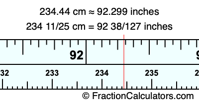 One centimeter is equal to 50/127 inches, and 234.44 as a fraction is 234 11/25. Therefore, to get the fractional answer to 234.44 cm in inches, we multiply 234 11/25 by 50/127 and simplify if necessary.