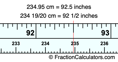One centimeter is equal to 50/127 inches, and 234.95 as a fraction is 234 19/20. Therefore, to get the fractional answer to 234.95 cm in inches, we multiply 234 19/20 by 50/127 and simplify if necessary.