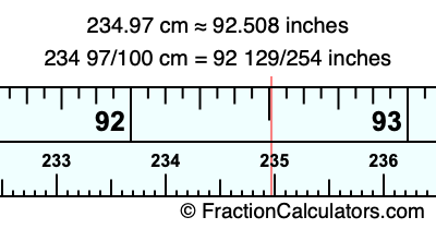 One centimeter is equal to 50/127 inches, and 234.97 as a fraction is 234 97/100. Therefore, to get the fractional answer to 234.97 cm in inches, we multiply 234 97/100 by 50/127 and simplify if necessary.