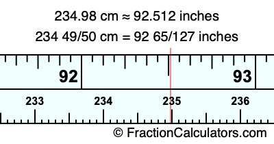 One centimeter is equal to 50/127 inches, and 234.98 as a fraction is 234 49/50. Therefore, to get the fractional answer to 234.98 cm in inches, we multiply 234 49/50 by 50/127 and simplify if necessary.