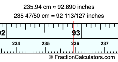 One centimeter is equal to 50/127 inches, and 235.94 as a fraction is 235 47/50. Therefore, to get the fractional answer to 235.94 cm in inches, we multiply 235 47/50 by 50/127 and simplify if necessary.